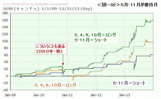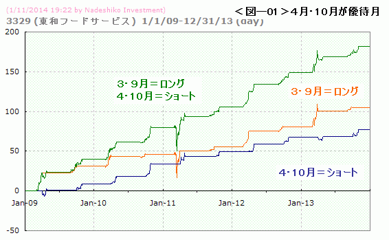 アノマリー度は過去5年のデータから、月別に上げ下げ傾向の強弱を調べたものです。データは、2013年12月30日の引け時点のものです。月別のアノマリーが優待によるものか季節性によるものかは不明です。