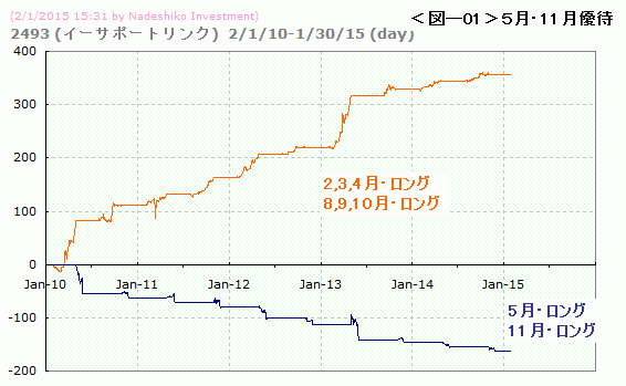 アノマリー度は過去5年のデータから、月別に上げ下げ傾向の強弱を調べたものです。データは、2015年1月30日の引け時点のものです。月別のアノマリーが優待によるものか季節性によるものか、あるいは偶然なのか、は不明です。