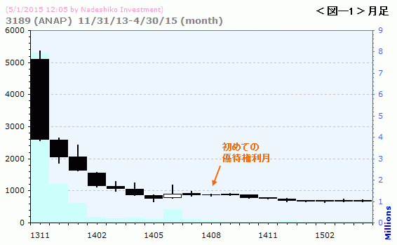 アノマリー度がトップになった「ANAP」。上場が2013年11月で過去の優待は1回です。上場以来下げ続けているわけですが、優待月の前後で下げが一旦止まっているのを見ると、優待は意識されているのかも知れません。高いアノマリー度は、殆ど毎月売りが正解(空売りはできません)という極端な結果によるもので、優待のためではありません。