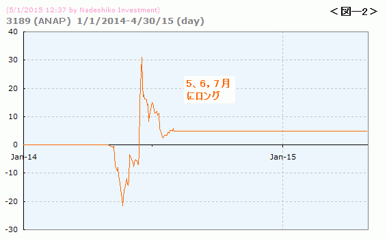 アノマリー度は過去5年のデータから、月別に上げ下げ傾向の強弱を調べたものです。データは、2015年4月30日の引け時点のものです。月別のアノマリーが優待によるものか季節性によるものか、あるいは偶然なのか、は不明です。
