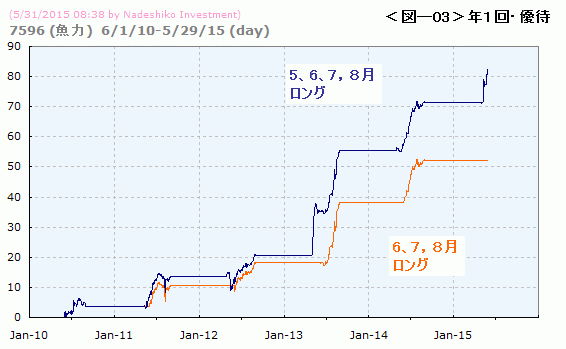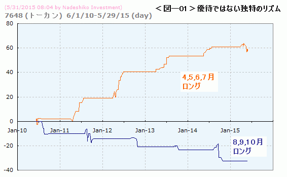 アノマリー度は過去5年のデータから、月別に上げ下げ傾向の強弱を調べたものです。データは、2015年5月29日の引け時点のものです。月別のアノマリーが優待によるものか季節性によるものか、あるいは偶然なのか、は不明です。