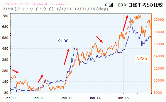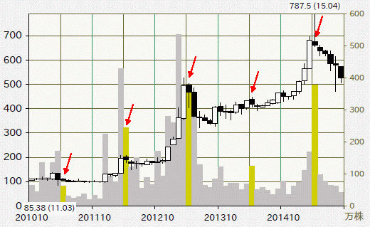 アイ・ケイ・ケイ(2198)の月足チャート。アノマリー情報CD-ROMの掲載銘柄で、そのスクリーンショットです(縮小しています)。赤の矢印で示したところが権利月で、出来高の色を変えて表示しています。権利月とその前3〜4ヶ月前の動きに着目し、優待が意識されていると思われる銘柄がCD-ROMに掲載されています。