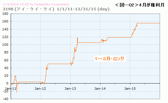 アノマリー度は過去5年のデータから、月別に上げ下げ傾向の強弱を調べたものです。データは、2015年12月30日の引け時点のものです。月別のアノマリーが優待によるものか季節性によるものか、あるいは偶然なのか、は不明です。