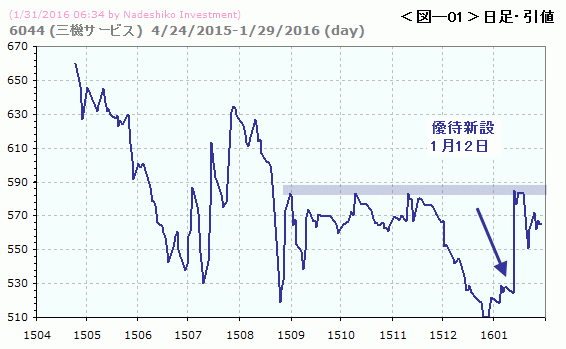 三機サービス(6044)。1月12日に株主優待制度の新設を発表しました。100株でクオカード1000円分だそうです(予想配当は15円)。優待新設で急騰しましたが、585円辺りの売りがこなせなかったようです。アノマリー度が高く表示されていますが、上場間もなくデータが少ないためです。