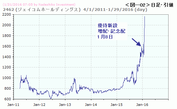 ジェイコム(2462)。1月8日に株主優待制度の新設を発表しました。100株でクオカード1000円分だそうです。同時に増配(+5円)と記念配5円も発表しました(年間配当40円)。発表の翌日急騰したものの、しばらく下押しされました。が、ここに来て爆騰が始まりました。どこで仕込めばよいのやら、いま乗っかるか、レジスタンスを見つけるまで眺めるか、人それぞれですね。