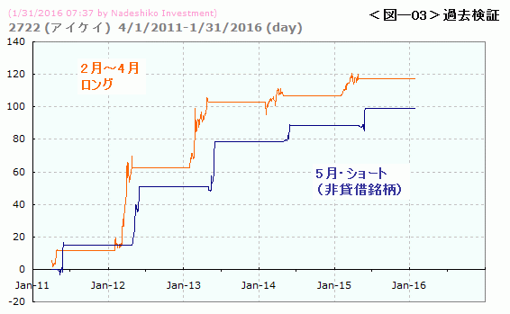 アノマリー度は過去5年のデータから、月別に上げ下げ傾向の強弱を調べたものです。データは、2016年1月29日の引け時点のものです。月別のアノマリーが優待によるものか季節性によるものか、あるいは偶然なのか、は不明です。