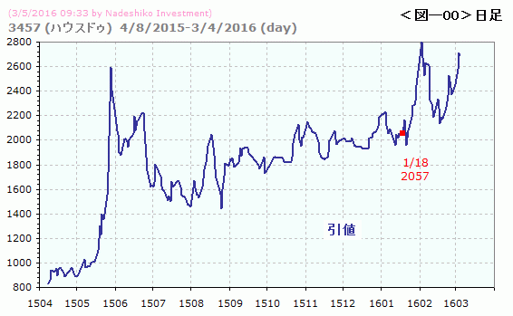 赤点で示したところが優待制度の導入を発表(引け後)した日です。その後の上げは、優待と言うよりは、業績予想の上方修正でしょう。上場来高値を更新し、期待感のある展開となっています。