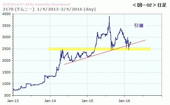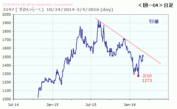 優待月の変更は2月10日の午後3時に発表されました(グラフの赤点)。年1回を年2回に単純に分ける、という話なのですが、同時に出た予想配当の増額(年33円→38円)もあって、株価はリバウンドしました。目先のトレンド的には赤線が示すように弱気な展開となっています。