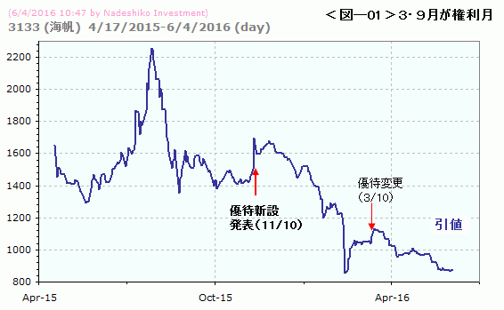 昨年の前半まで、長年の上昇トレンドが継続してきたわけですが、市場全体の混乱が、高所恐怖症を発生させる面はあったと思われます。しかし、直近の大下げは、3月14日に発表された優待の変更(優待券→割引券)しか理由が見あたりません。従来よりは優待パワーは減少した、と考えた方が良さそうです。