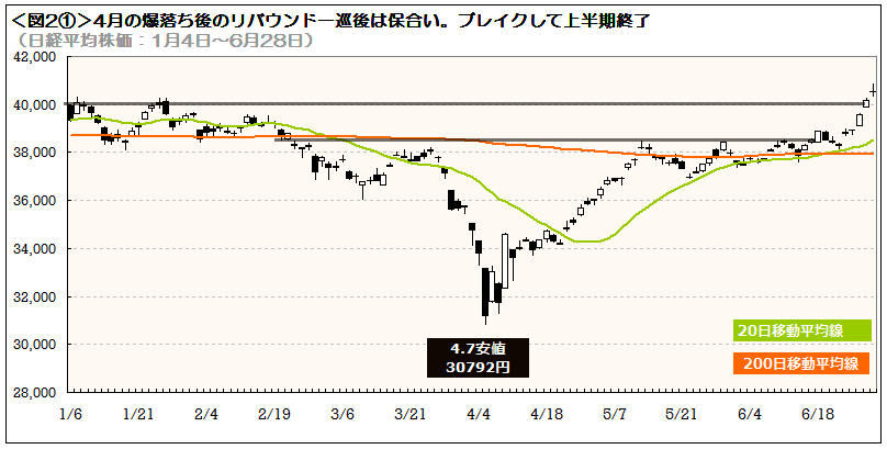 4月7日の爆落でひとまず下げは止まってリバウンドモードに転換。それが5月半ばまで続きましたが、そこから3万8000円水準を上値とする保合いが始まります。これを下に抜けてしまうと「第三段目の爆下げ」を覚悟しなければならないパターンです。が、チャートの予測とは反対に、6月終盤この保合いを上放れ。そして4万円台回復で上半期終了です。