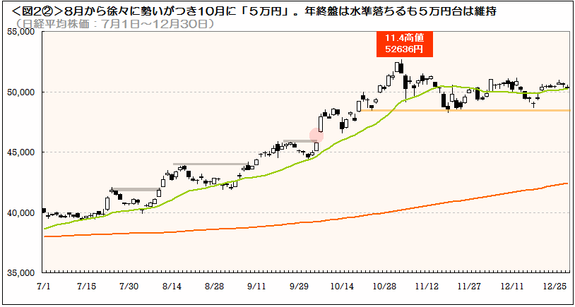 この最高値以降は水準を落としましたが、大きく下値を崩すことはなく、5万円をはさむ上げ下げとなって5万339円という、5万円台を維持した形で2025年を終えています。