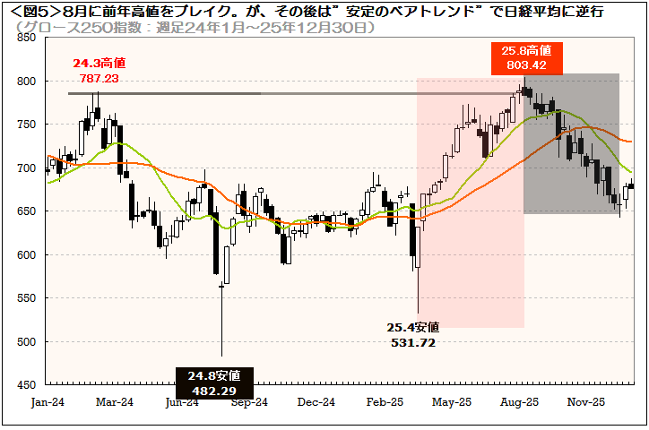 4月の爆落からのリバウンドは強く、8月19日には800ポイントを超えて前年3月の高値をブレイクするという、長期トレンドの強気転換まで示唆されていたのですが、その高値をピークにベア転。12月半ばまで、実に安定したベアトレンドが継続しています。「日経平均5万円」など、それこそ別世界の話です。
