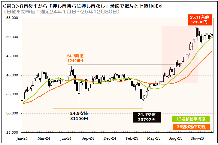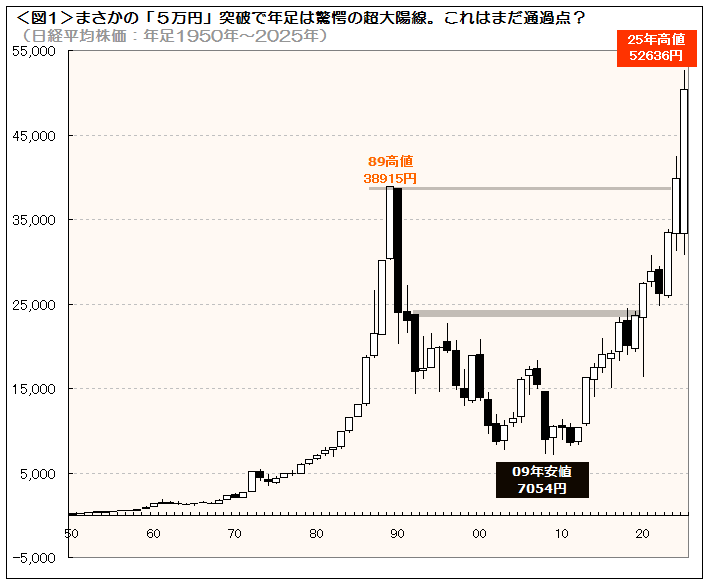 この最高値以降は水準を落としましたが、大きく下値を崩すことはなく、5万円をはさむ上げ下げとなって5万339円という、5万円台を維持した形で2025年を終えています。