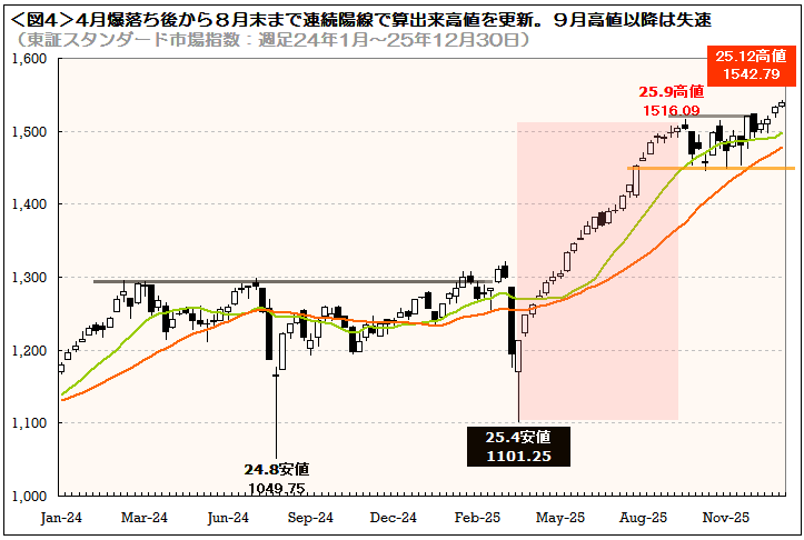 もっとも、2025年を通じて株式市場全体が絶好調だったわけではありません。2025年の日経平均株価を振り返ると、まず年初から2月半ばまでは、前年8月に起きた大暴落のリバウンド一巡後から始まった上値4万円・下値3万8000円の上げ下げ。気の滅入る保合いがそのまま続きます。