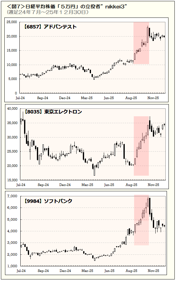 米国の主力AI銘柄の関連で買われやすく、日経平均株価に対する寄与度が極めて高い3銘柄。日経平均株価は225銘柄で構成されていますが、「これではnikkei225じゃなくてnikkei3だろう」などと揶揄されていたほどです。